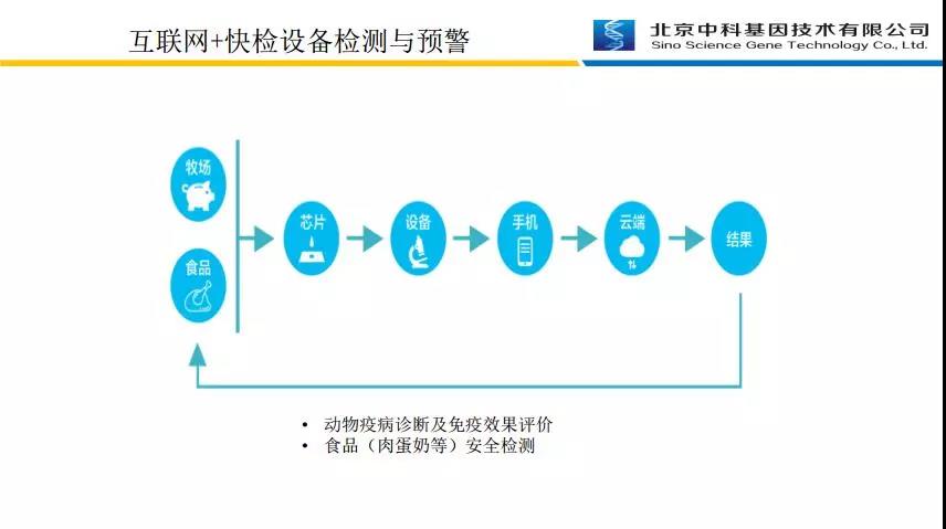 朱连德介绍指出,北京中科基因是国内首家通过CMA认证的动物疫病检测第三方实验室连锁机构,将在全国建设省级检测中心30个,联合实验室200个,实验室联盟1000个,基层兽医服务工作站2000个,通过共享实验室和共享专家体系,构建大数据平台和智慧兽医体系,致力于打造动物健康管理和安全畜产品生产生态圈。