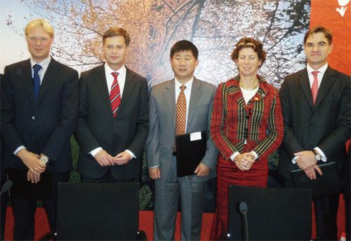 heus;左二为时任荷兰首相;左三为禾丰牧业金卫东董事长;左四为时任荷兰农业部部长;右一为为时任荷兰合作银行亚洲区总裁。